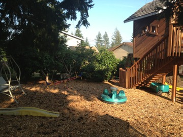 Steps leading up to the treehouse, teeter totter, merry go round, and roller coaster